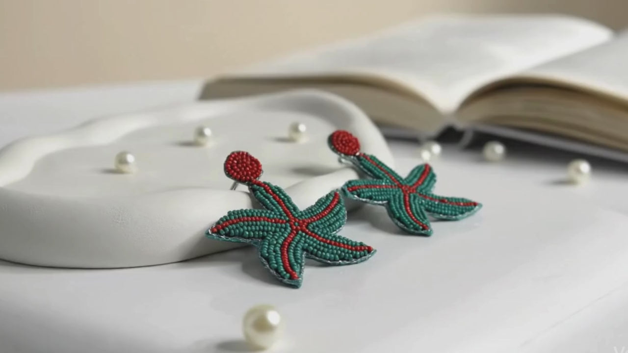 Eye-catching handmade statement earrings crafted in a starfish motif with detailed green, red, and black beadwork. Lightweight and unique, these earrings bring a fun ocean-inspired charm, perfect for casual outings, vacations, and Indo-western styling.